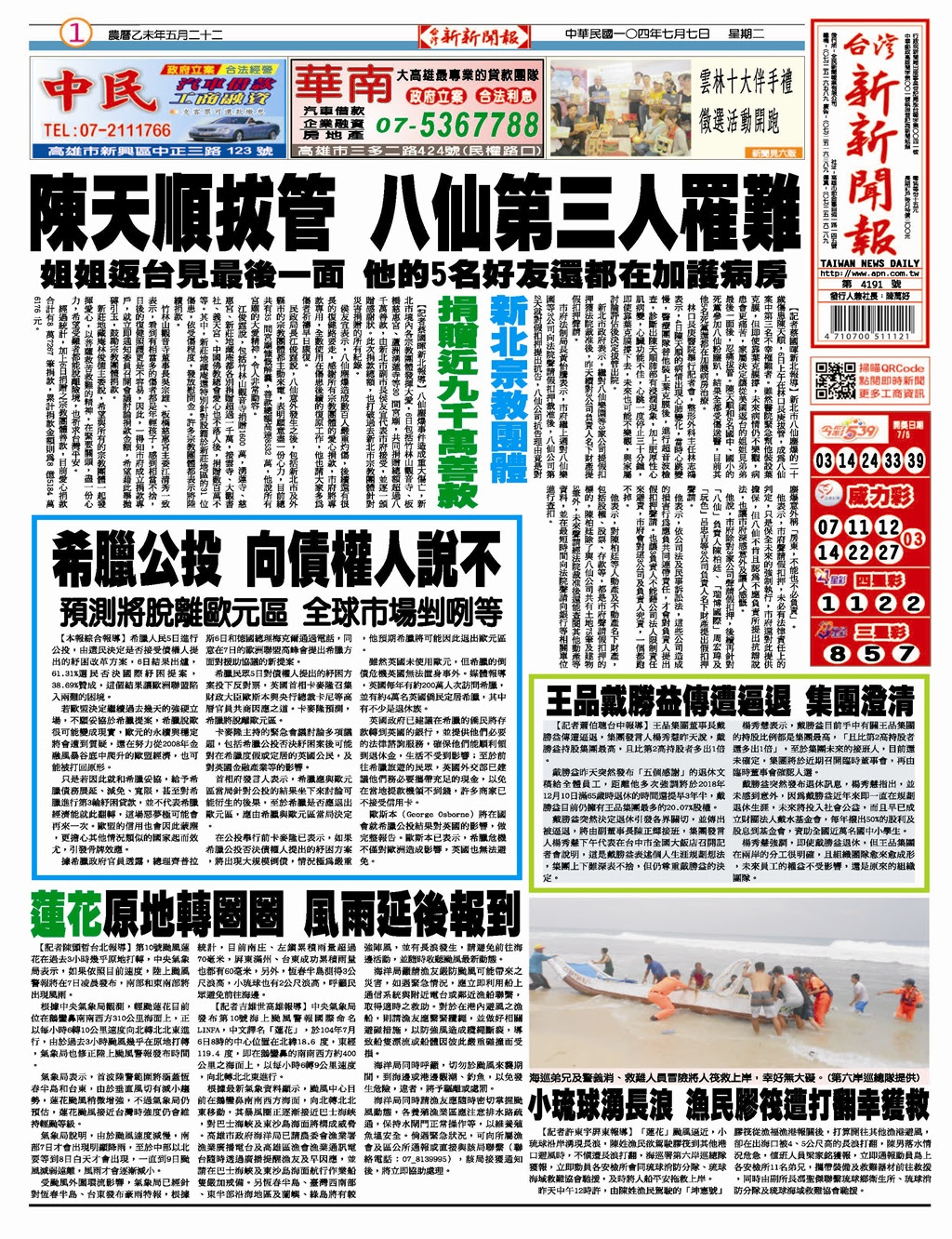 Open publication - Free publishing - More newnews 上面影像若無法顯示 請點我連結電子報 上面影像若無法顯示 請點我連結電子報 =======================TOP 20130331新新聞報各版新聞照片精華 2013年3月31日 請點上方縮圖看今日所有新聞照片 *********************** 新新聞報第3363號102年3月31日星期日農曆癸巳(蛇)年二月二十 [第1版]要聞 (第1版)北院裁定 賴素如收押禁見 (第1版)台灣高等法院29日撤銷台北地院有關台北市議員賴素如交保裁定,發回更裁。北院30日裁定賴素如與雙子星案被告程宏道(圖)收押禁見,晚間將他送往看守所。.jpg (第1版)台灣高等法院29日撤銷台北地院有關台北市議員賴素如(前)交保裁定,發回更裁。北院30日裁定賴素如收押禁見,晚間將她送往看守所。.jpg (第1版)新北艦成軍 總統宣示海洋維權 (第1版)海巡新艦成軍 統統宣示保疆護漁1.JPG (第1版)海巡新艦成軍 統統宣示保疆護漁2.JPG (第1版)漢神巨蛋千萬竊案 2嫌落網 (第1版)總統馬英九30日南下高雄主持海巡署新造2000噸級新北艦與1000噸級巡護8號雙艦成軍典禮,除視察海巡特勤操演並搭艦出海。.jpg (第1版)總統馬英九30日南下高雄主持海巡署新造2000噸級新北艦與1000噸級巡護8號雙艦成軍典禮,除視察海巡特勤操演並搭艦出海,宣示政府保疆護漁決心。(.jpg (第1版)職棒台南第三戰 週末掀熱潮 (第1版)雙子星案 下波追查官員議員 (第1版)黨主席選舉 馬:沒改變決定 新新聞報第3363號102年3月31日星期日農曆癸巳(蛇)年二月二十 [第2版]綜合新聞 (第2版)0330德魯灣橋旁工寮火警搶救.jpg (第2版)0330德魯灣橋旁工寮火警搶救住宅火警 一老翁受困 (第2版)0330行動台灣謝坤宏拜訪黨代表表態參選黨主席.JPG (第2版)0330行動台灣謝坤宏拜訪黨代表表態參選黨主席 (第2版)二代健保小叮嚀:繳納補充保險費 要記得申報 (第2版)受327六點一級地震後影響中市房屋倒塌有驚無險一人受輕傷圖.jpg (第2版)受327六點一級地震後影響中市房...